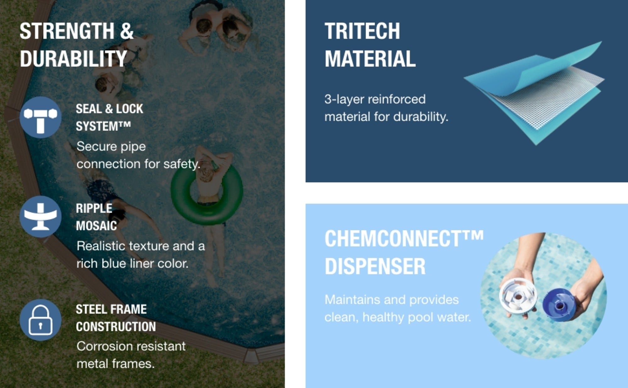 - Corrosion resistant steel frame above ground pool is held together with our Seal & Lock System™ to provide remarkable strength and connection