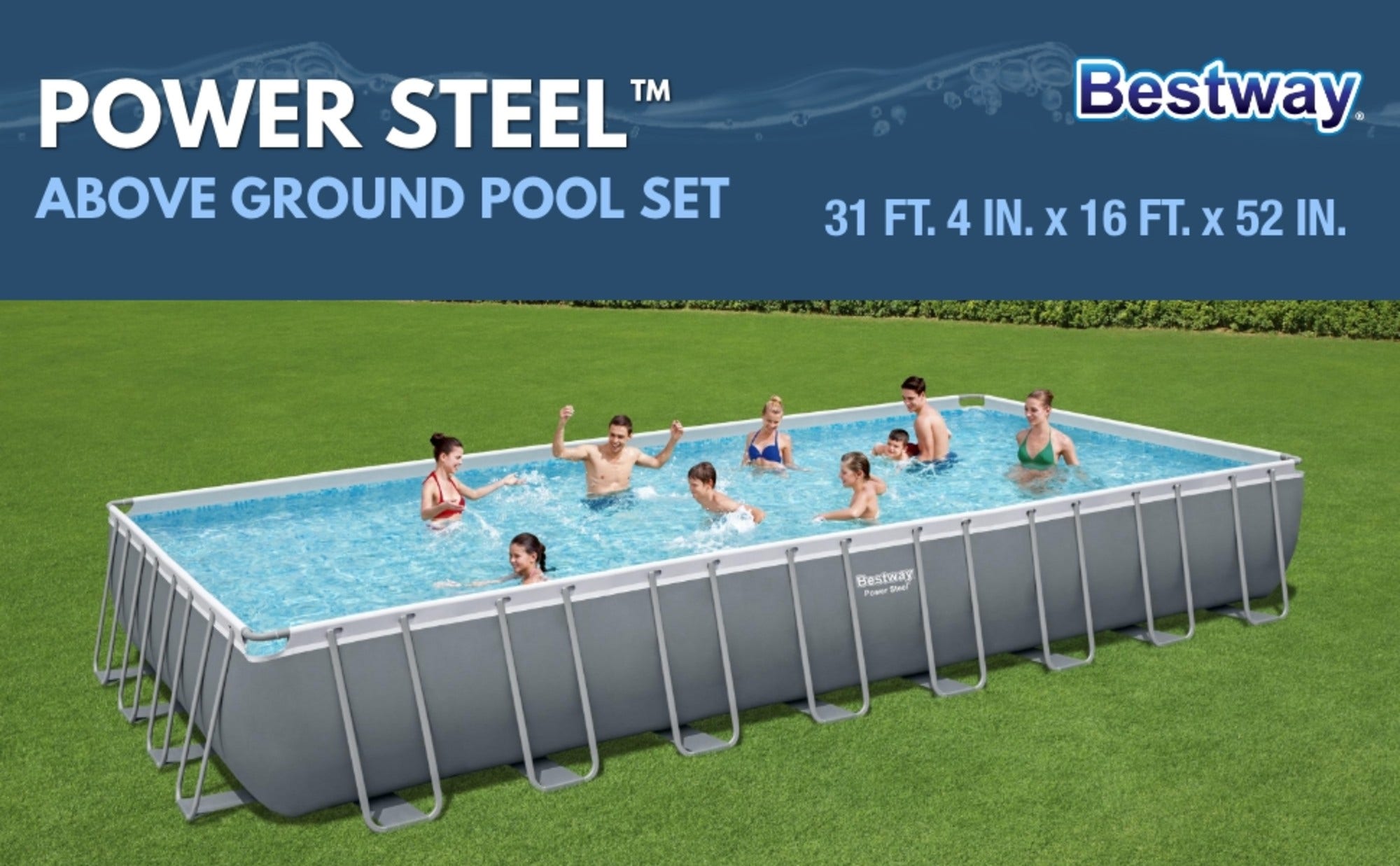 Have the summer of your (and your kids’) dreams with an above ground pool right in your own backyard! Durable Construction: The Bestway® Power Steel™ Above Ground Pool is easy to set up and built to last. The durable steel frame is equipped with our Seal & Lock System™ for a sturdy and secure pipe connection. The frame connectors also prevent metal-on-metal contact to ensure corrosion and rust resistance. The sturdy Tritech™ liner is made out of an ultra-durable 3-layer material that is reinforced for strength and puncture-resistance. Tritech is 15% more tear resistant, 33% more stretch resistant and 83% more puncture resistant than standard PVC, ensuring your pool will last summer after summer. Additional Features: This above ground pool set also comes stocked with a sand filter pump, a ladder, a pool cover and a ChemConnect™ chemical dispenser. The ChemConnect dispenser maintains clean, healthy pool water by providing a stable level of chlorine that is evenly dispersed throughout the pool. Have fun in the sun and relax the day away with this Power Steel Pool Set!