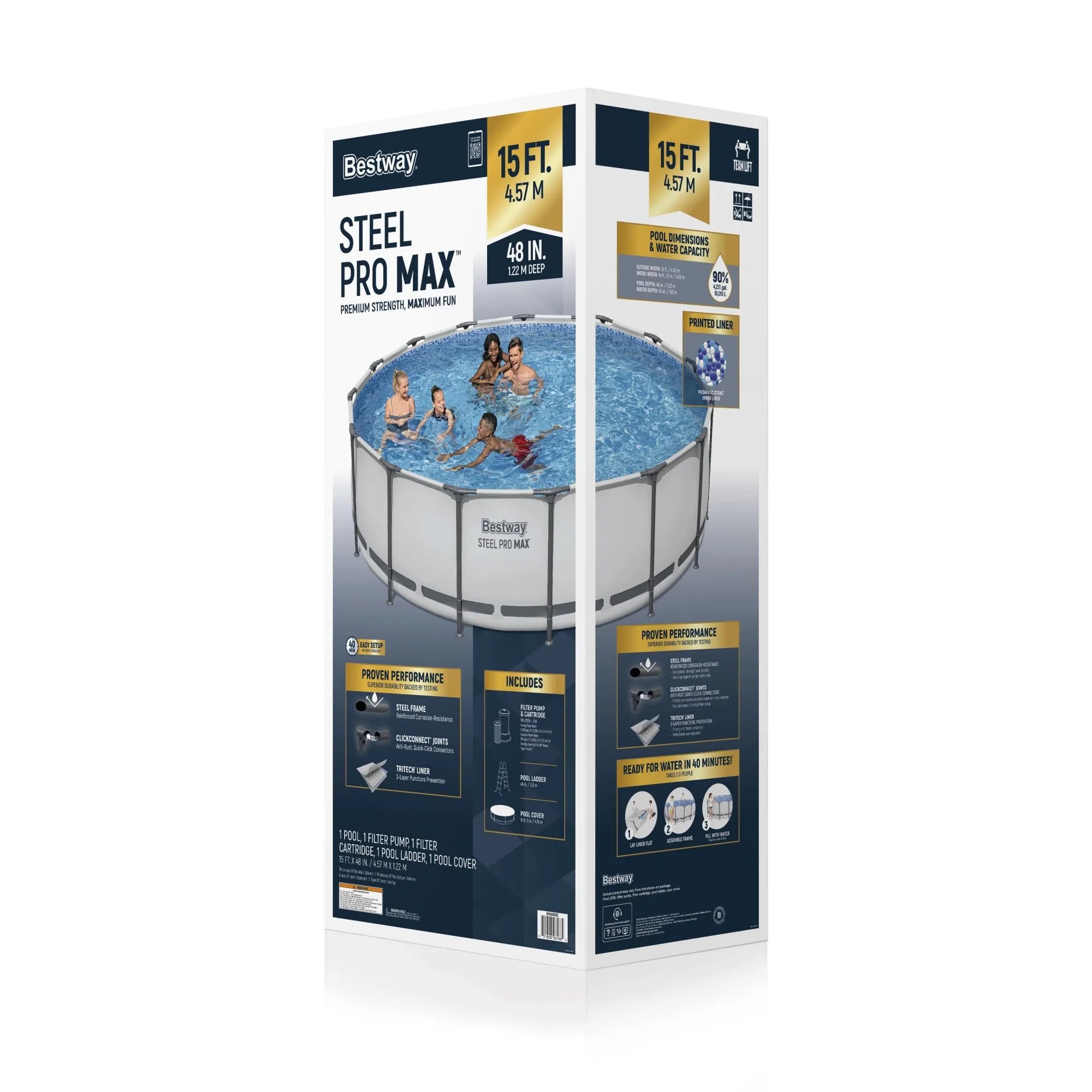 It doesn’t get any better than having your very own pool in your backyard! The Bestway® Steel Pro MAX™ Above Ground Pool offers an ultra durable option at a great price. Durable Construction: The durable pool frame is constructed with superior corrosion-resistant steel to ensure stability and longevity. The ClickConnect™ joints make setting the pool up a breeze, with no additional tools or accessories needed. The frame connectors also prevent metal-on-metal contact to ensure rust-resistance. The sturdy Tritech® liner is made out of an ultra-durable 3-layer material that is reinforced for strength and puncture-resistance. Tritech is 15% more tear-resistant, 33% more stretch-resistant and 83% more puncture-resistant than standard PVC, ensuring your pool will last summer after summer. Additional Features: This above ground pool set also comes stocked with a filter pump, a ladder and a pool cover. Plus, this pool is very simple to set up and to take down for off-season storage. No tools are required, and a hose connects to the built-in flow control valve to quickly and easily drain away pool water. Spend your summer on the water in this Bestway Steel Pro MAX pool!
