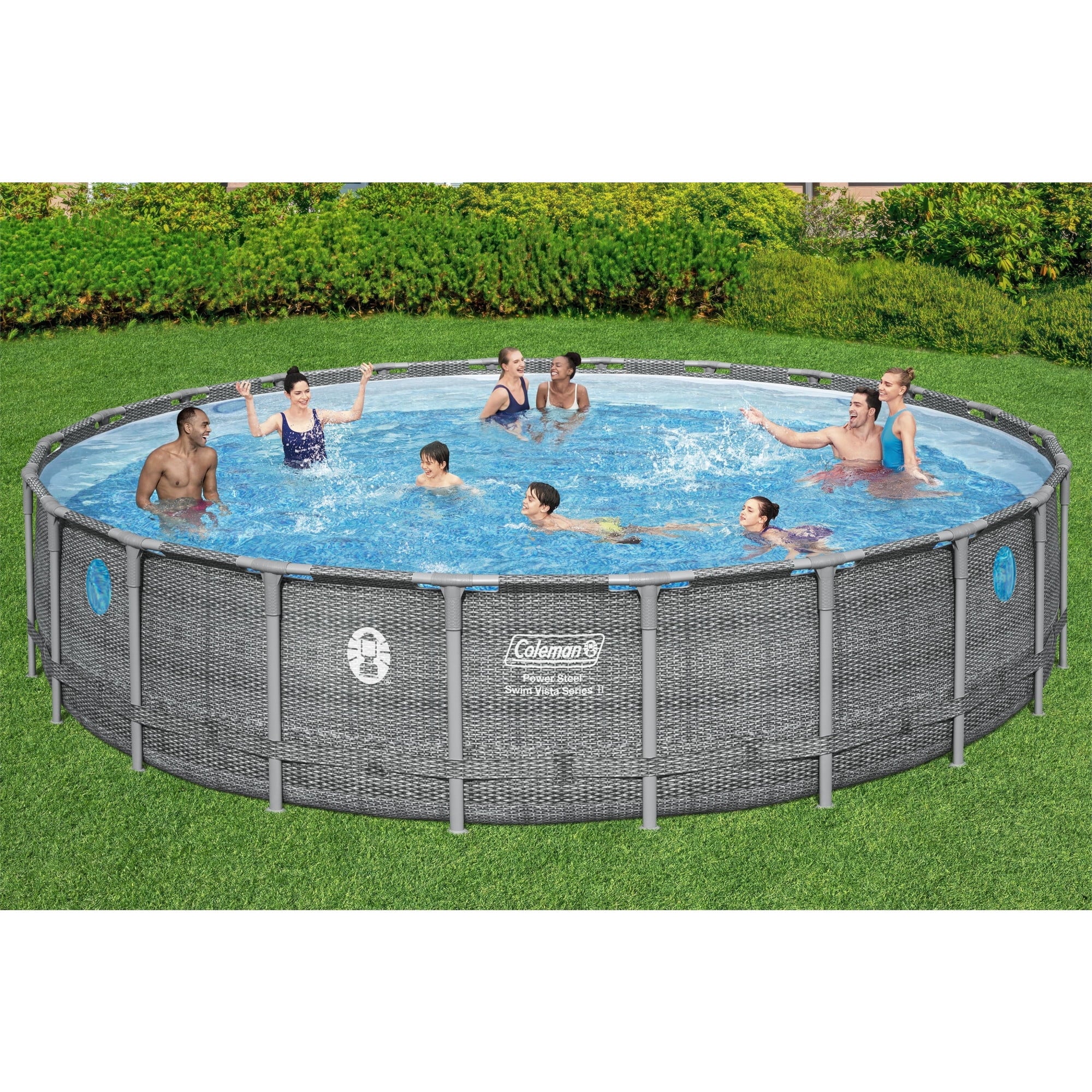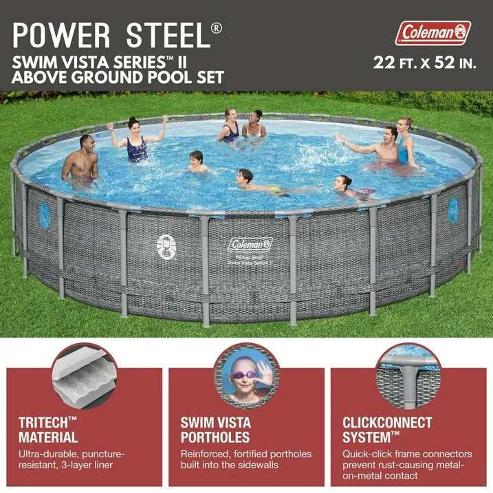 Enjoy a summer full of fun with the Coleman Round Power Steel Frame Above Ground Pool Set for Adults and Kids. Back and better than ever, the Power Steel Series offers a truly unique pool experience. Crafted with Tritech-enhanced 3-layer liner technology, this pool set redefines strength. Each set includes everything you need to make a splash including 1 pool, 1 filter pump (compatible with Type III cartridge), 1 ladder, 1 pool cover, and 1 repair patch. With a water capacity of up to 10,668 gallons (40,377 liters) at 90 percent capacity, there's plenty of room for aquatic fun for the whole family. Designed to withstand the elements, this pool boasts properties that resist corrosion, ensuring years of enjoyment without compromising on quality. Ideal for adults and families alike, it offers a maximum depth of 52 inches, providing ample space for swimming and relaxation. Available in a vibrant gray finish and featuring an elegant round shape, this Coleman pool elevates your outdoor space with its sleek design. Measuring 264 by 52 inches when assembled, it fits seamlessly into your backyard oasis, becoming the focal point of endless summer memories. Experience the difference and transform your backyard into a haven of relaxation and enjoyment as you splash the day away with the Coleman Round Power Steel Frame Above Ground Pool Set for Adults and Kids from Coleman.