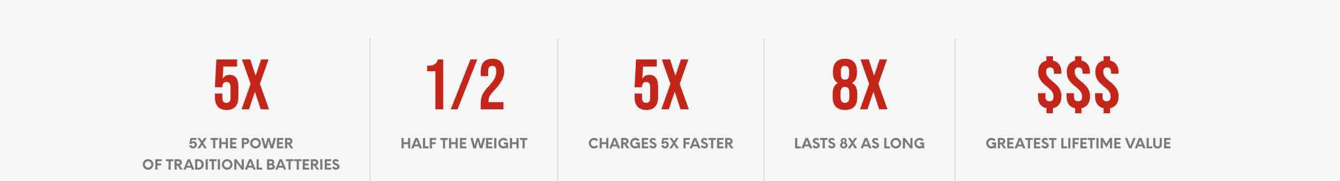 - Quick Charging: Charges up to five times faster than traditional batteries, with the ability to reach a full charge within 60 minutes when paired with a high-amp charger.