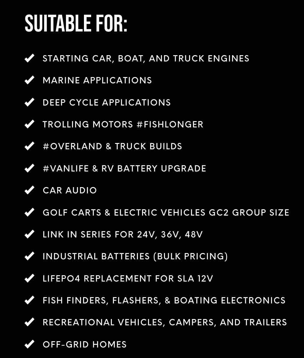 - Marine and Automotive Compliance: Meets and exceeds the American Boating and Yachting Council (ABYC) standards for lithium battery use in marine applications. Compatible with most marine and automotive charging systems, ensuring easy integration.