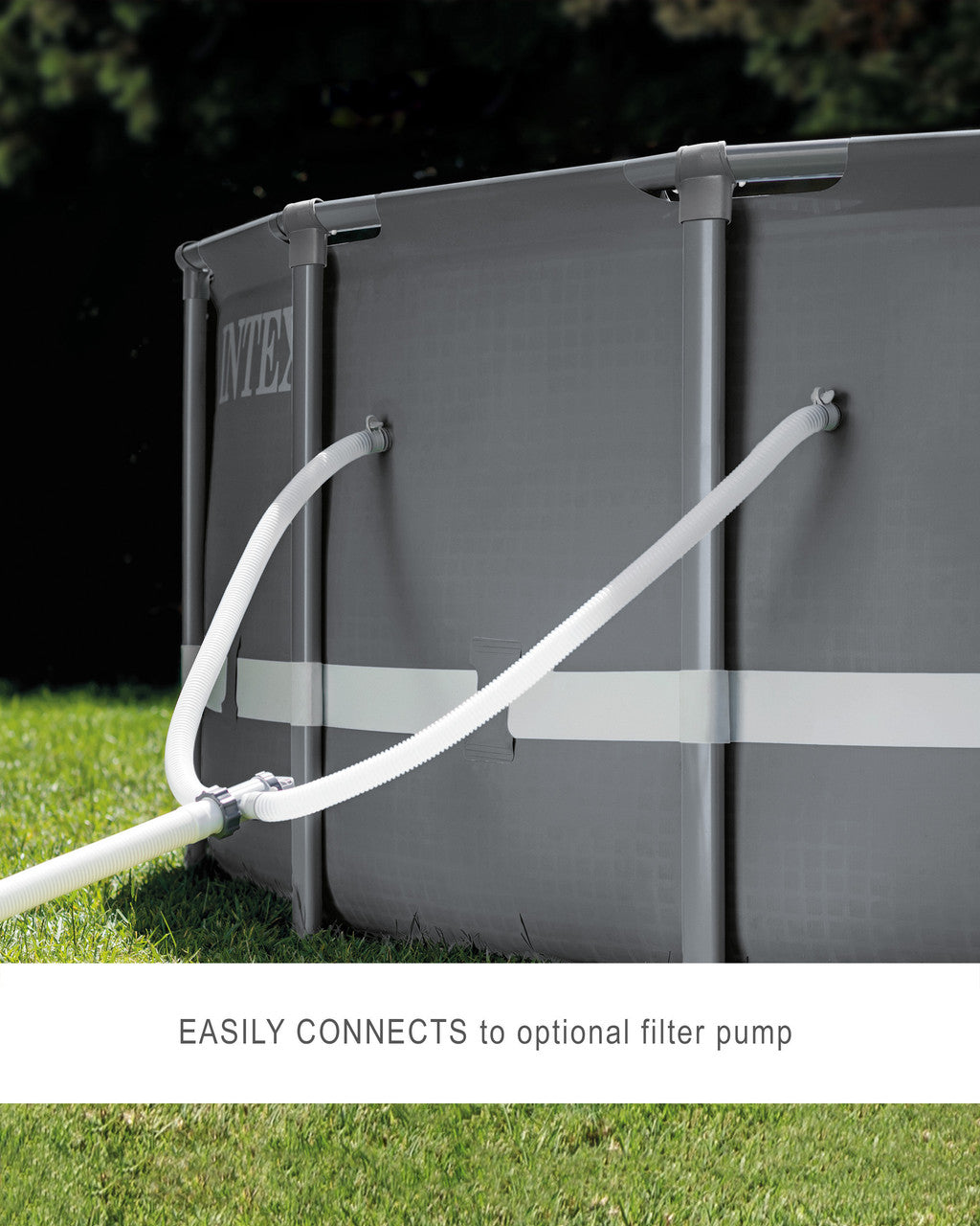 Make a splash this summer with the INTEX Ultra XTR Round Frame Pool Set. The round swimming pool design is perfect for narrow backyards, lap swimmers, and pool games. The Ultra Frame design provides excellent durability and a sleek gray finish, all while making setup quick and easy. Our framed swimming pools include everything you need for a great pool experience, including the powerful INTEX model 26647EG Krystal Clear Sand Filter Pump. The sand filter pump saves you time, money, and frustration with your backyard swimming pool. The sand filter function replaces the need to buy expensive filters by only needing routine backwashing, and the sand only needs replacing once every 5 years. Swim your summer days away and have a blast in the water with this INTEX Ultra Frame Rectangular Pool Set. Note: Requires flat, level ground for proper installation. Disclaimer: Please review your HOA rules and restrictions before purchasing this product. Not all housing agencies permit private above-ground pools.