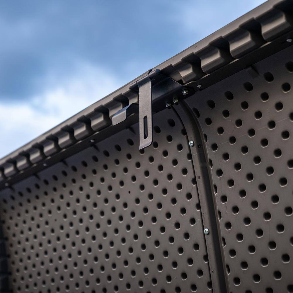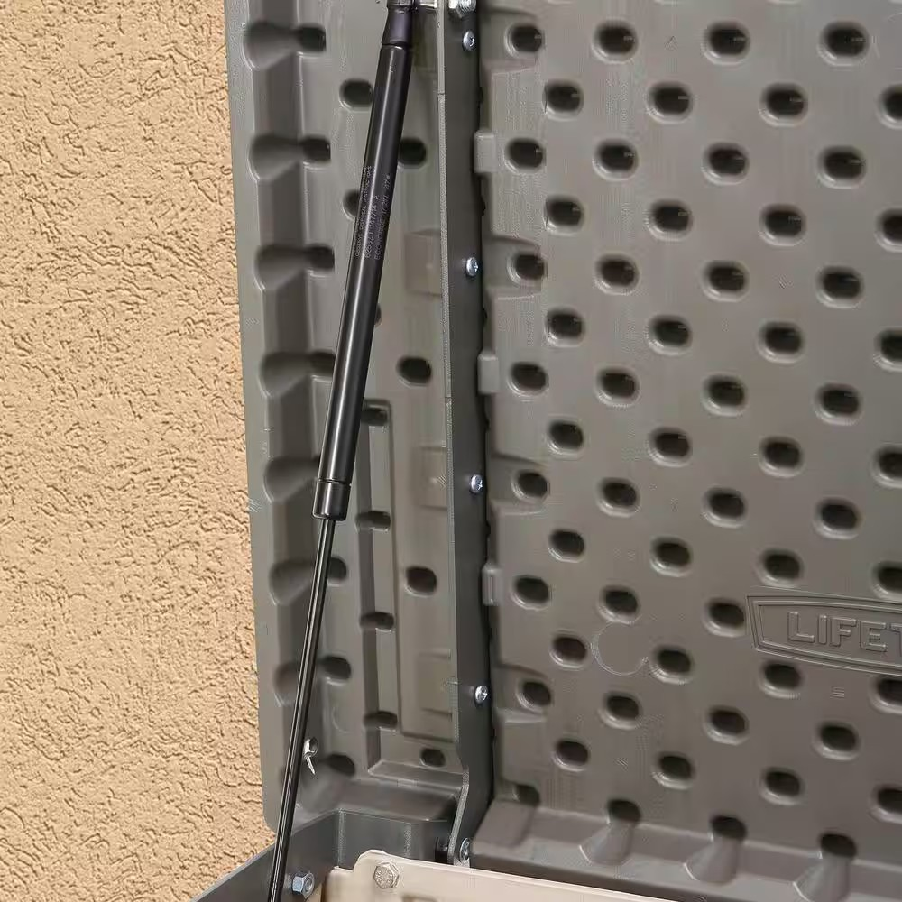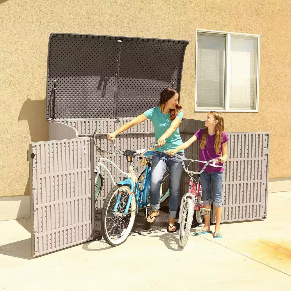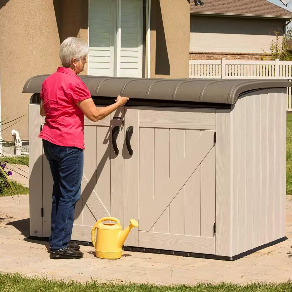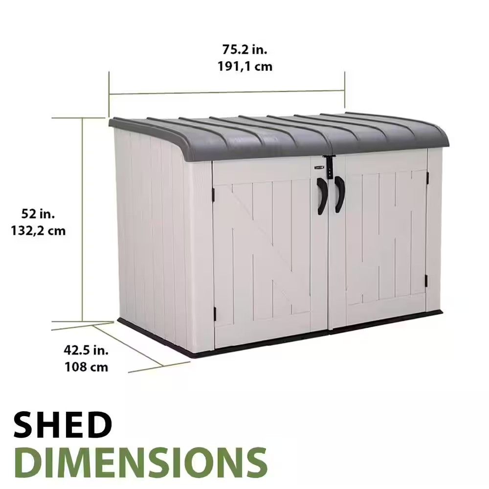 Lifetime's newest horizontal shed for storing bikes, garbage cans, fire wood, and other items. Clean up the yard and get organized with a beautiful storage unit that won't fade or crack in the sun. In fact, the plastic is fade-resistant with UV protectants to give you years upon years of use. The locks protect against theft and vandalism giving you the security that your items are out of sight and locked away safely. Its UV-protected construction and weather-resistant design help keep your valuables safe. Store two large garbage cans, or anything you need extra room for.